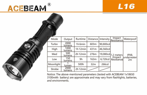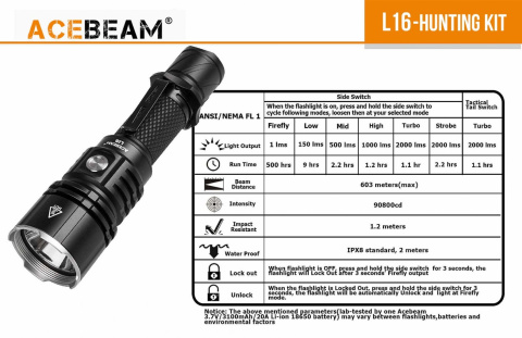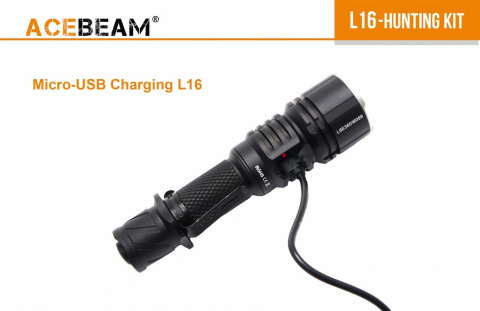 Latarka AceBeam L16-Hunting Kit z mikro-USB akumulatorem przeznaczona dla myśliwych,organów ścigania, wojskowych i podobnych zastosowań.