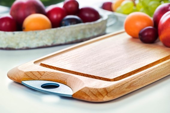 Poręczna deska do krojenia z jasnego, litego drewna, wyposażona w praktyczny uchwyt i estetycznie wykończona fazowanym obrzeżem. Jest łatwa w konserwacji, nie tępi noży i nadaje wnętrzom ciepły, pogodny charakter.