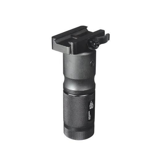Chwyt pionowy to jeden z najczęściej stosowanych dodatków do karabinków, który zwiększa kontrolę nad bronią oraz ułatwia manewrowanie nią. Chwyt UTG 4,7 wykonano z aluminium lotniczego i wykończono techniką anodowania o dużej odporności na ścieranie. Powierzchnię metalu poddano moletowaniu, dzięki czemu chwyt nie wyślizguje się nawet z mokrej lub spoconej dłoni. Funkcjonalność chwytu zwiększa wewnętrzny przedział chroniony szczelną nakrętką, w którym możemy przenosić drobne akcesoria np. baterie do kolimatora lub latarki (CR123). Rączka przystosowana jest do montażu na szynie Picatinny i Weaver, dzięki czemu może być stosowana jako tradycyjny chwyt przedni lub wspornik do oparcia kolby. Do mocowania na szynie zastosowano dźwignię QD, śrubę Torx i sprężynująca płytkę ze stali. Za sprawą sprężynującego mechanizmu Posi-lock chwyt można zablokować w 2 pozycjach (pionowej i poziomej) w zależności od preferencji i sytuacji.