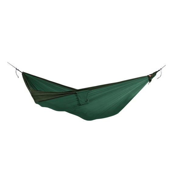 Hamak dwuosobowy Ticket To The Moon King Size to idealne rozwiązanie dla osób poszukujących hamaka o większym rozmiarze i wyższym poziomie komfortu noclegu pod gołym niebiem. Hamak poza turystyką, wspaniale sprawdzi się jako element wyposażenia ogrodu lub działki, pełniąc funkcję wypoczynkową i rekreacyjną zarówno dla osób dorosłych, jak i dzieci. Hamak Ticket To The Moon waży jedynie 700 gramów, a po spakowaniu do pokrowca zajmuje niewiele miejsca - łatwością zmieści się do plecaka czy torby. Przedstawiony model jest w kolorze zielono - ciemnozielonym.