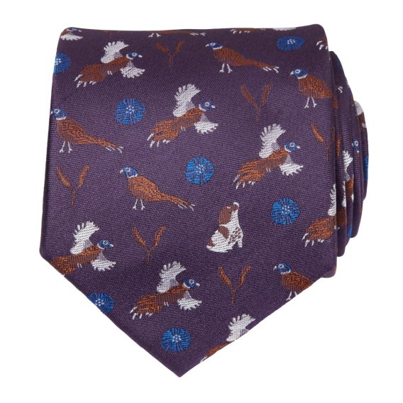 Krawat Chevalier Spaniel Silk Tie to stylowy dodatek do stroju łowieckiego, który będzie wspaniałym pomysłem na prezent dla myśliwego. Chevalier Spaniel Silk Tie to jedwabny krawat żakardowy z motywem zwierzęcym, pasujący do stroju myśliwskiego i codziennego. Krawat o klasycznej szerokości utrzymany w gaszonej fioletowej kolorystyce. Ozdobny haft z motywami bażanta, psa i ornamentu roślinnego dyskretnie podkreśla myśliwski styl. Krawat dostarczany jest w eleganckim pudełku prezentowym.