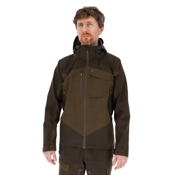 Materiał kurtki charakteryzuje się wysoką odpornością na uszkodzenia mechaniczne, co sprawia, że idealnie sprawdza się podczas wędrówek w zaroślach czy wśród gałęzi. Tkaniny tworzą skuteczną barierę przed wilgocią, jednocześnie zapewniając oddychalność. Wodoodporność na poziomie 20.000 mm i oddychalność 20.000 g/m2/24h gwarantują membrany Orttex, natomiast elastyczne materiały w strategicznych miejscach, takich jak ramiona czy dół kurtki, dodatkowo wzbogacone membraną 10k/10k, zapewniają pełną swobodę ruchu i ochronę przed deszczem. Specjalny krój oraz ergonomiczna długość rękawów umożliwiają pełną mobilność podczas aktywności.