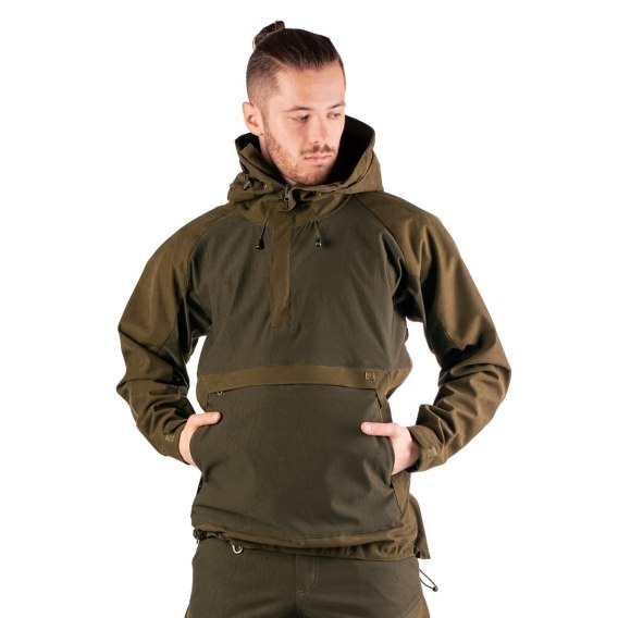 Strefy najbardziej narażone na wilgoć wykonano z trwałej tkaniny z membraną o parametrach 20K/20K, która skutecznie chroni podczas długich wędrówek w trudnym terenie. Nawet przy kontakcie z mokrymi gałęziami czy krzewami, materiał pozostaje nieprzemakalny, zapewniając dodatkową ochronę przed zimnym wiatrem. Partie pod pachami, górną część pleców i klatkę piersiową wykonano z elastycznej tkaniny z przewagą wiskozy, co gwarantuje pełną swobodę ruchów i doskonałą mobilność ramion. Dzięki takiemu zestawieniu materiałów kurtka jest nie tylko odporna na rozdarcia i ścieranie, ale również skutecznie chroni przed wiatrem i wilgocią. Pionowe szczeliny wentylacyjne i membrana 20K/20K zapewniają efektywne odprowadzanie wilgoci, utrzymując komfort termiczny.