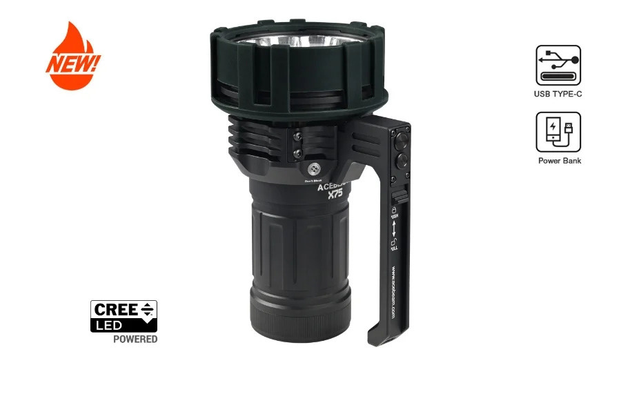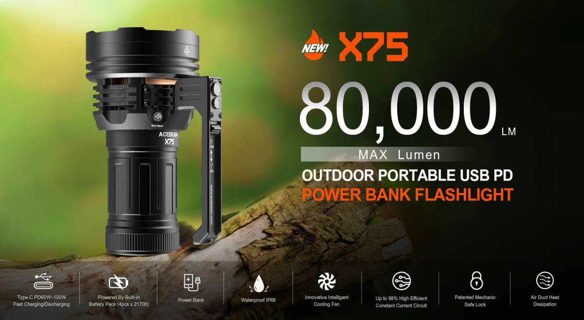 Przedstawiamy Państwu najnowszą i najmocniejszą latarkę marki Acebeam: X75 w wersji 70.2 6500K 60W z funkcją Power banku