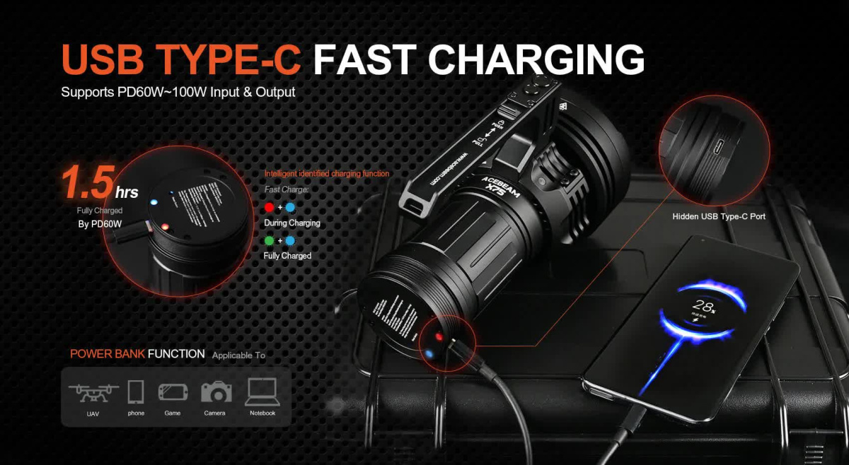 • Szybkie ładowanie USB Type-C PD60W (standard); pełne naładowanie latarki zajmuje około 90 minut.