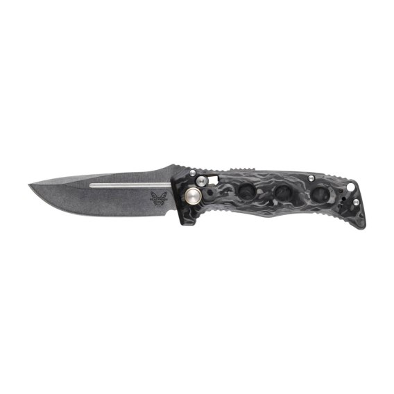Za bezpieczeństwo pracy odpowiada flagowy mechanizm Benchmade, dwustronna blokada Axis-lock, ceniona za ogromną wytrzymałość mechaniczną, odporność na zabrudzenie oraz wygodę obsługi dla prawo i leworęcznych użytkowników. Zwolnienie automatycznie załączającego się suwaka blokady powoduje otwarcie głowni. Aby dodatkowo zabezpieczyć nóż przed otwarciem lub złożeniem, możemy wykorzystać dodatkowy, grzbietowy suwak mocujący.