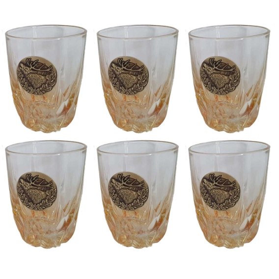 Komplet składa się z sześciu szklanek o owalnej podstawie, zdobione mosiężnymi medalionami z wizerunkiem ryczącego jelenia oraz bursztynowym natryskiem naniesionym na spód szklanki. Bursztynowe zdobienie wspaniale podkreśla głębię barwy whisky.