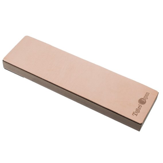 W celu osiągnięcia płynniejszego odczucia krojenia, warto pomyśleć o tak zwanym "stroppingu", czyli końcowym wyrównywaniu i polerowaniu krawędzi tnącej na miękkim materiale, takim jak skóra. Jedną z często spotykanych metod jest skórzany pasek, przymocowany do ściany lub drzwi, a firma Tojiro zaproponowała wygodniejszą opcję, czyli „skórzany kamień".
