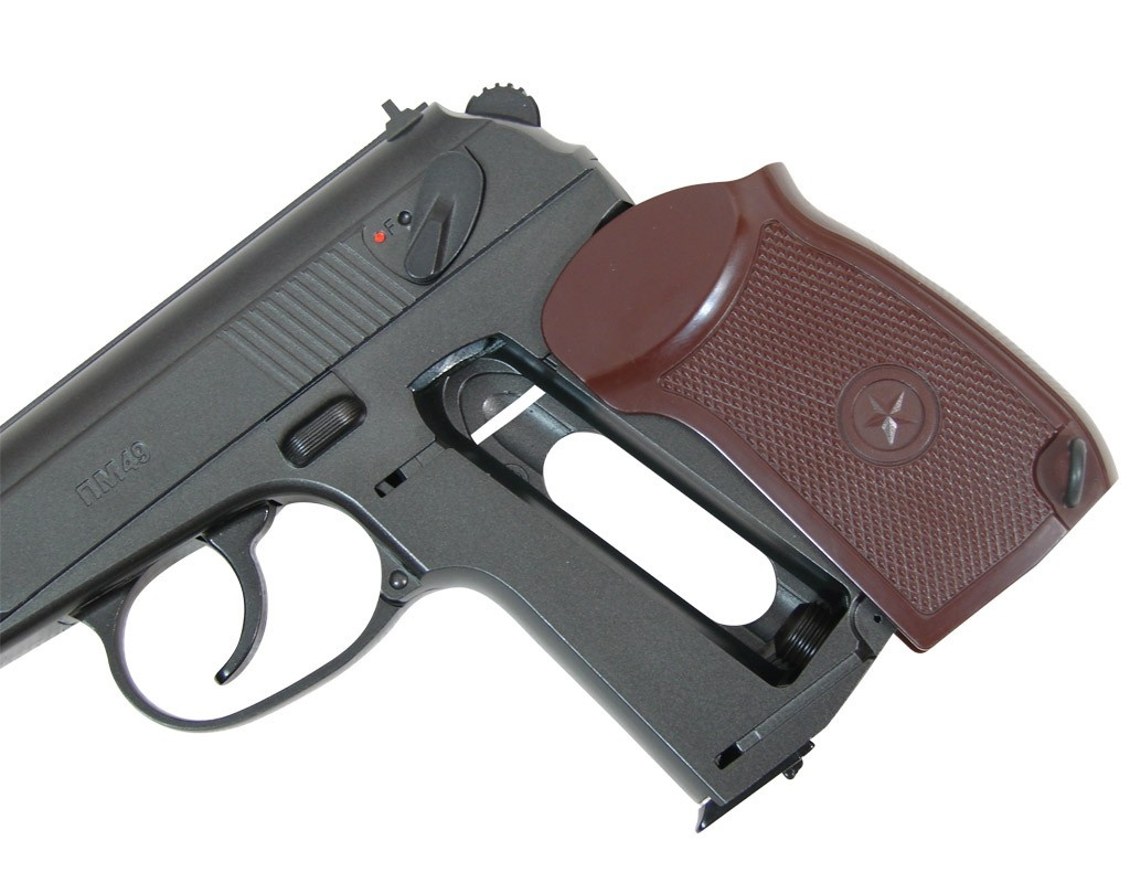 PM49ma na rękojeści brązowe nakładki, co dopełnia podobieństwa do znanego oryginału Makarova. Aby zamontować wewnątrz nabój CO2, konieczne jest przesunięcie rękojeści pistoletu w tył. Umożliwia to dostęp do komory ładowania oraz śruby dociskowej.