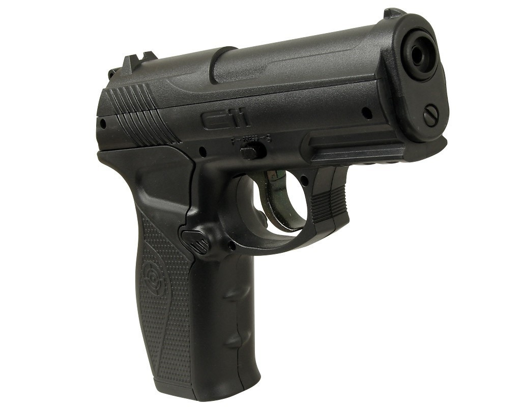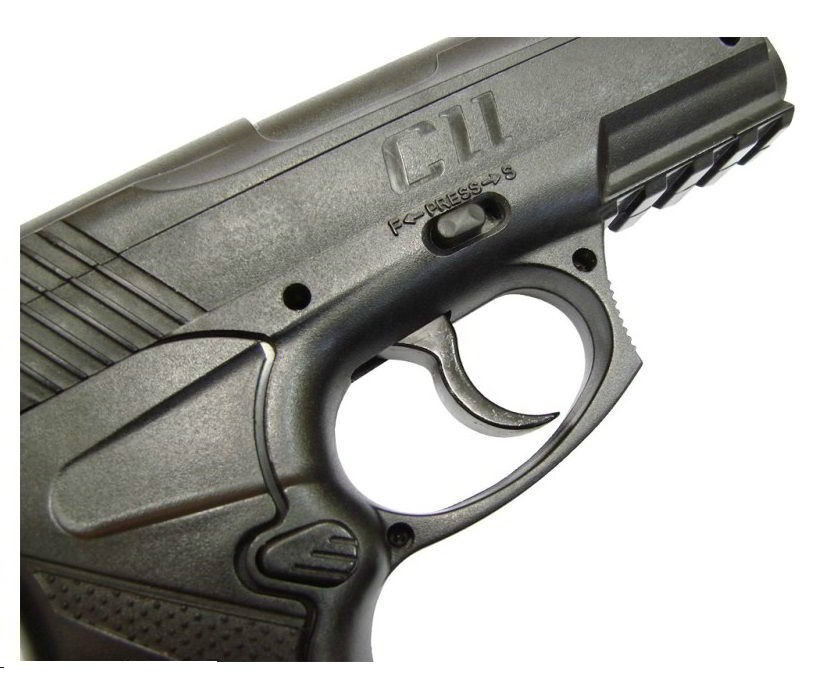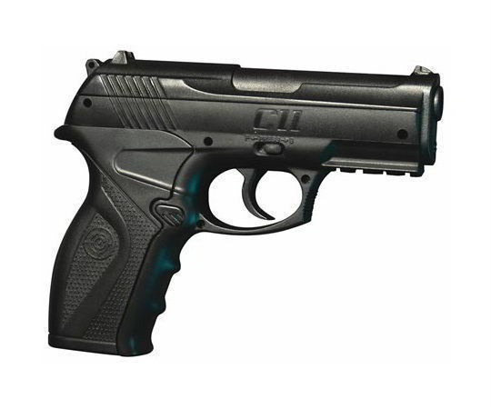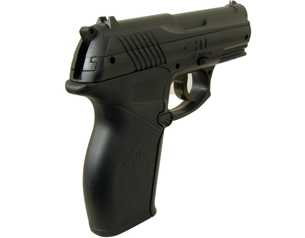Półautomatyczny pistolet na śrut okrągły 4,5 mm, nawiązujący stylistyką do Beretty PX4 Storm.