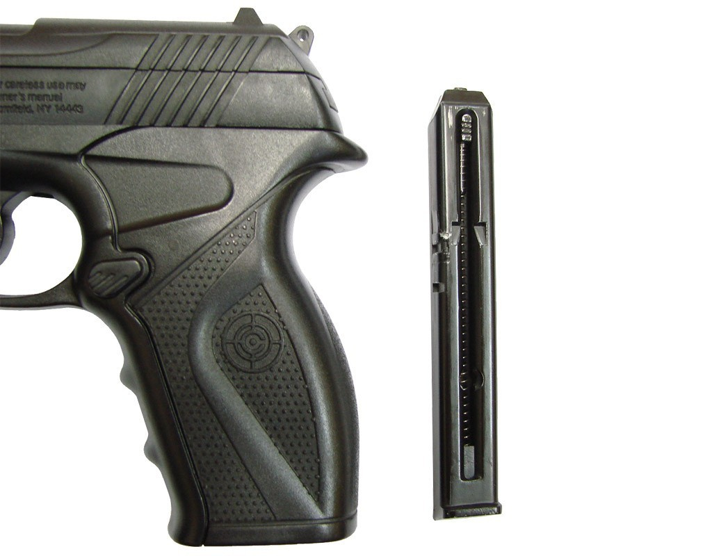 Szkielet wiatrówki wykonano z wytrzymałego tworzywa ABS, które doskonale imituje oryginalne polimery stosowane we współczesnej broni palnej. Ruchoma lufa, mechanizmy wewnętrzne oraz wymienny magazynek pudełkowy zostały wykonane ze stali. Ładowany do rękojeści dwurzędowy magazynek mieści 18 okrągłych śrucin (typ BB) kalibru 4,5 mm. Polecamy dokupienie dodatkowych magazynków!