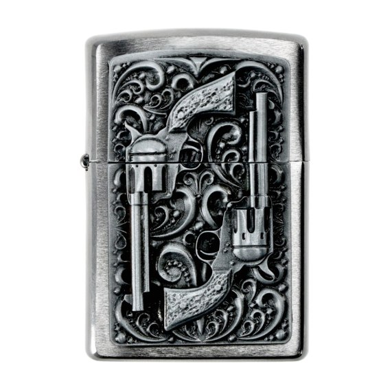 Zapalniczka benzynowa Zippo to prawdziwa ikona wśród tego typu urządzeń, będąca wręcz synonimem zasilanego benzyną modelu. Wysoka niezawodność, doskonała jakość wykonania oraz skuteczne zabezpieczenie płomienia przed wiatrem sprawiają, że zapalniczki Zippo cieszą się niesłabnącą popularnością od czasów Drugiej Wojny Światowej, kiedy to służyły amerykańskim żołnierzom w trudnych warunkach walk na Pacyfiku. Już teraz możesz skorzystać z nieocenionych zalet tego ikonicznego produktu w wersji wizualnej, która będzie najlepiej wyrażała Twoją osobę. Omawiany model został ozdobiony kowbojskim motywem rewolwerów.